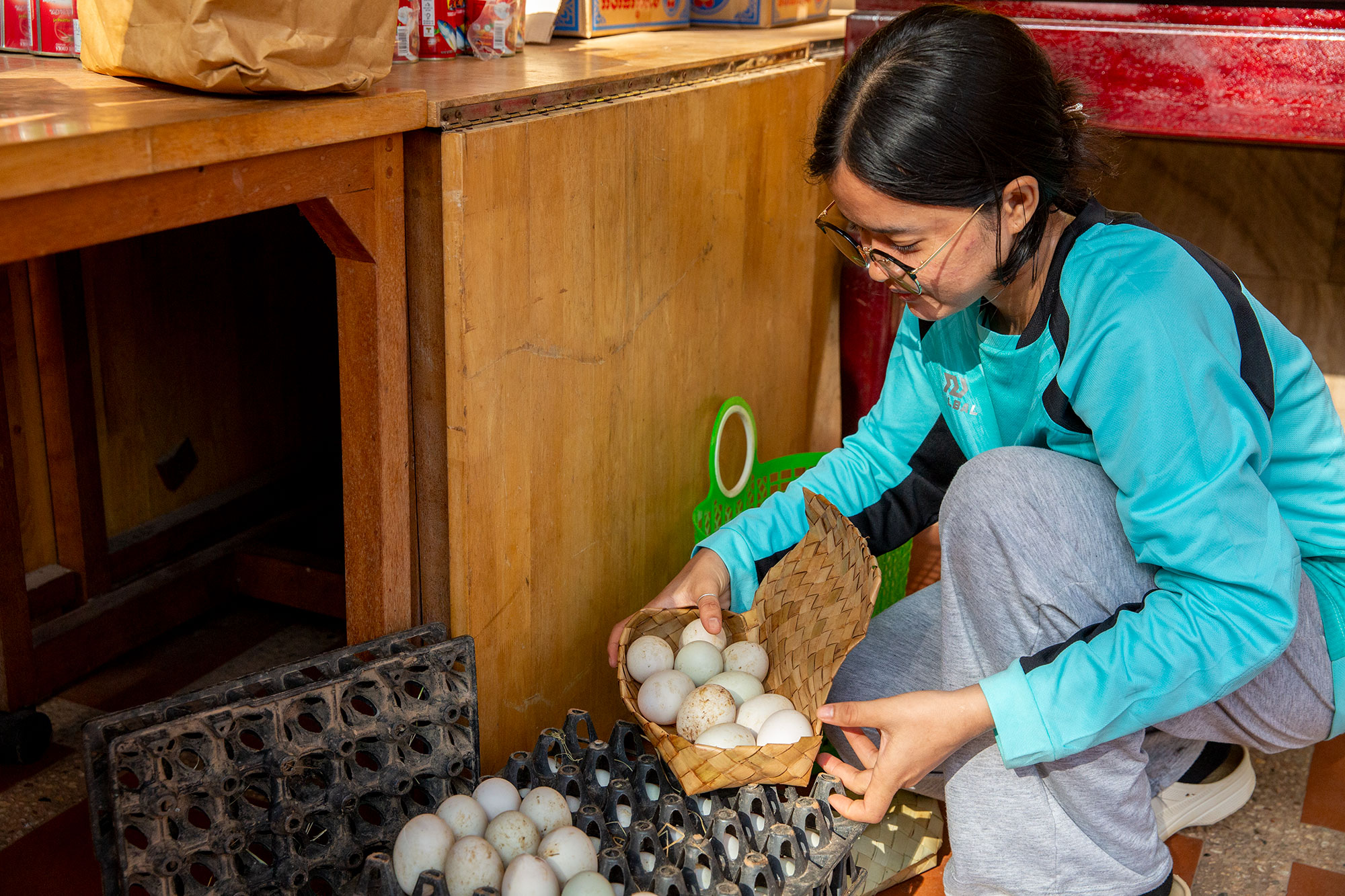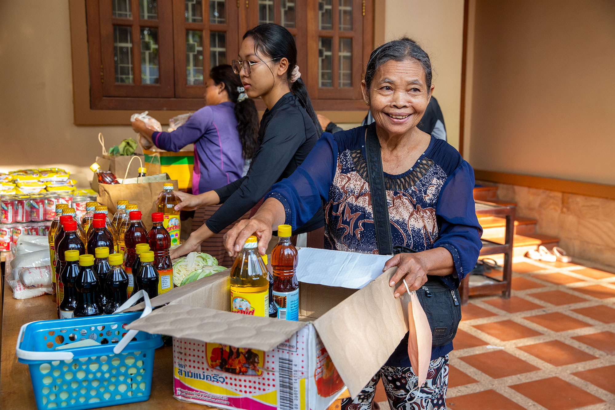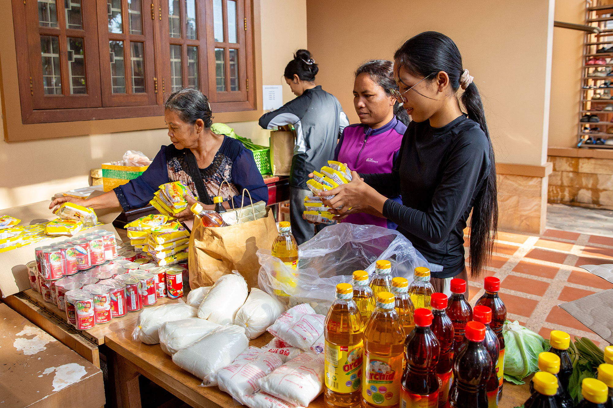 Zu Beginn des Monats erhalten die Familien eine grössere Grundration. Je nach Haushaltsgrösse umfasst diese unter anderem bis zu 25kg Reis, Nudeln, Öl, Fischkonserven, Salz, Zucker sowie Soja- und Fischsauce. Ergänzt wird die Grundversorgung durch frische Lebensmittel wie Gemüse, Eier, getrockneten Fisch und Fleisch. Zwei Wochen später stehen erneut Frischwaren im Fokus. Zudem werden Seifenstücke abgegeben.