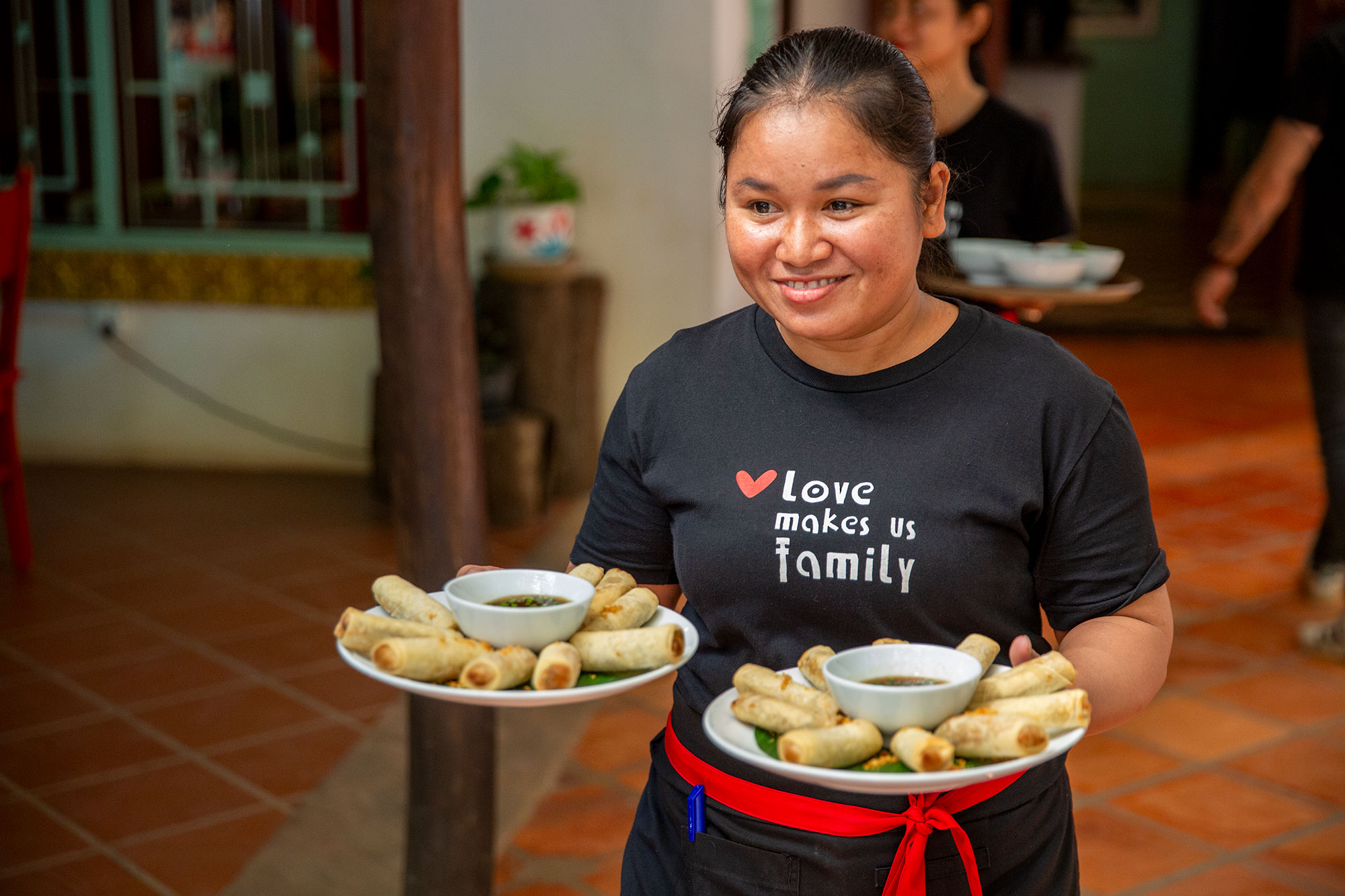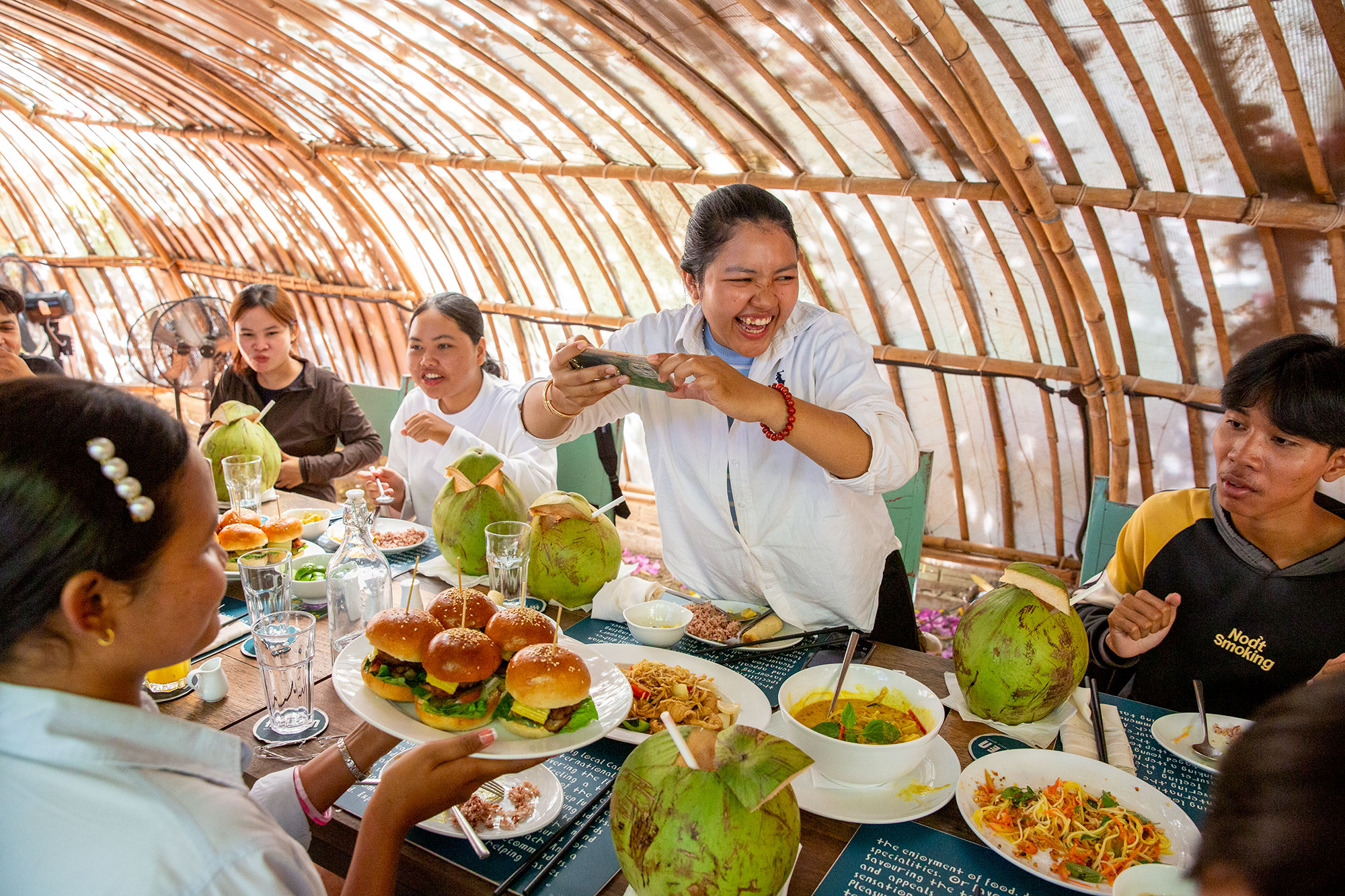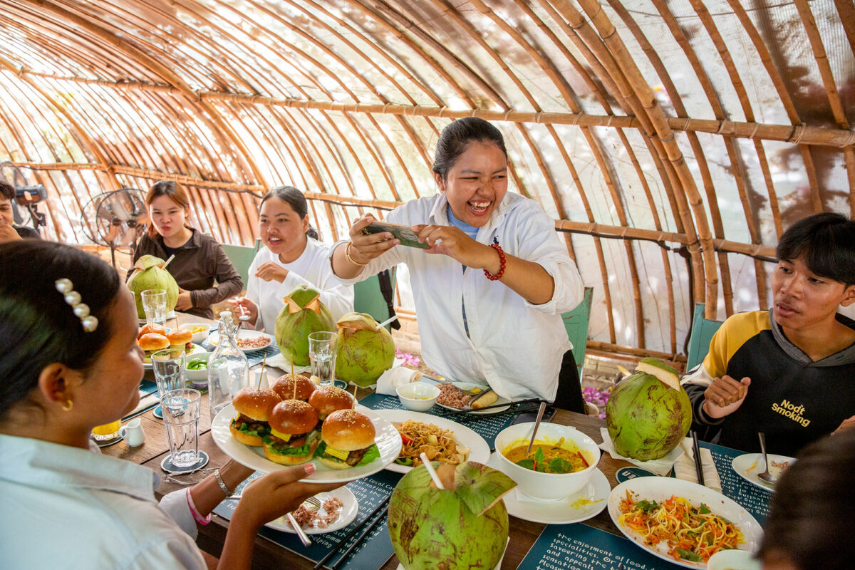 Wie in Kambodscha üblich, wurde im „Family Style“ serviert. Die verschiedenen Gerichte wurden in die Mitte der Tische gestellt und gemeinsam geteilt. Auf dem Tisch standen Fried Spring Rolls, Green Mango Salad, Fried Ginger Chicken und Amok Fish. Ergänzt wurde das Menü mit Mini HAVEN Cheeseburgers. Zum Dessert gab es kleine Schokoladenkuchen. Die wenigen Reste, die übrig blieben, packten die Jugendlichen ein und brachten sie ihren Familien mit nach Hause.