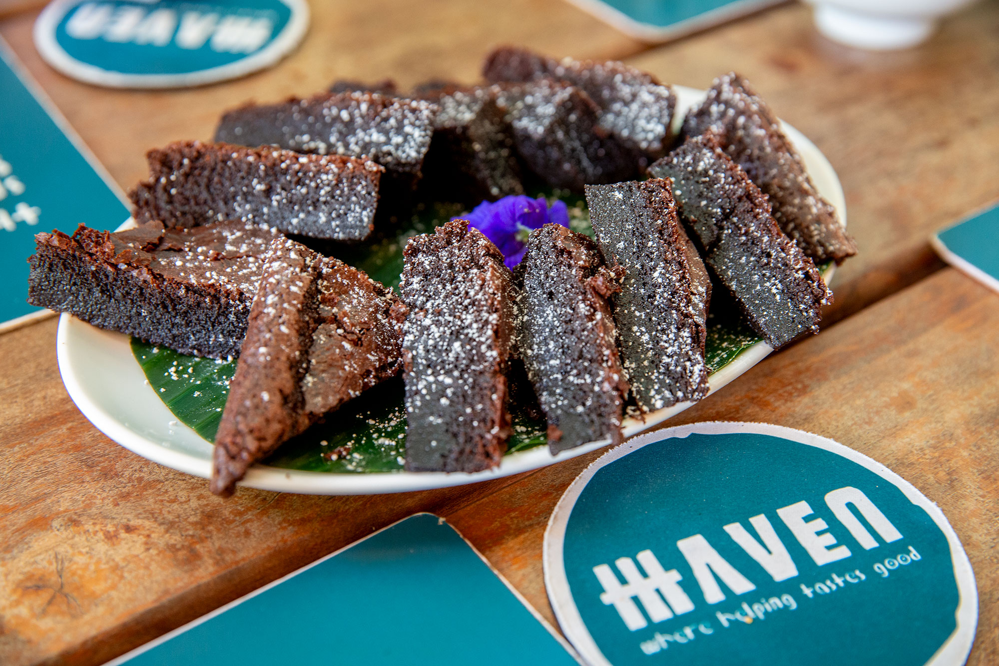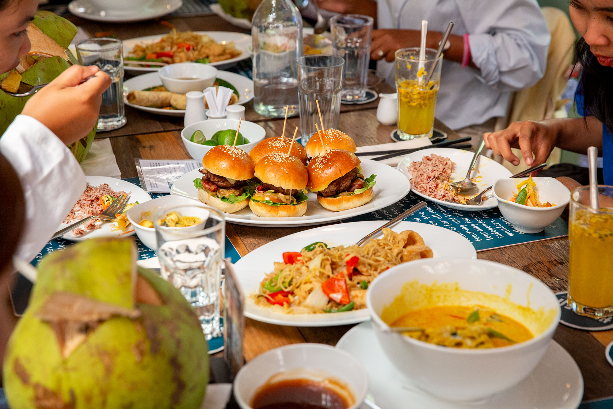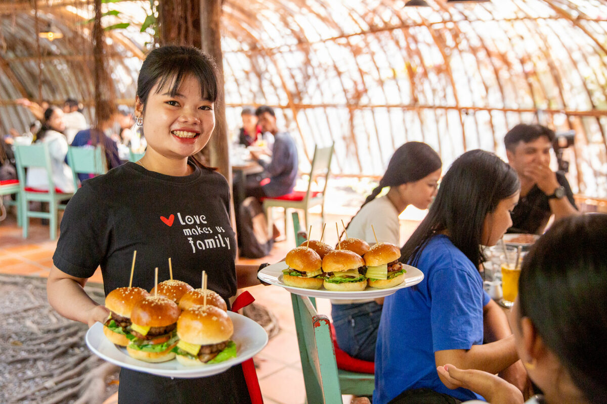 Wie in Kambodscha üblich, wurde im „Family Style“ serviert. Die verschiedenen Gerichte wurden in die Mitte der Tische gestellt und gemeinsam geteilt. Auf dem Tisch standen Fried Spring Rolls, Green Mango Salad, Fried Ginger Chicken und Amok Fish. Ergänzt wurde das Menü mit Mini HAVEN Cheeseburgers. Zum Dessert gab es kleine Schokoladenkuchen. Die wenigen Reste, die übrig blieben, packten die Jugendlichen ein und brachten sie ihren Familien mit nach Hause.