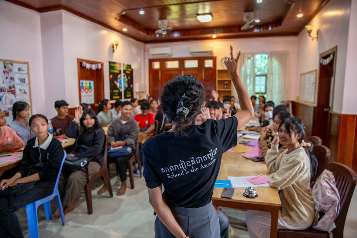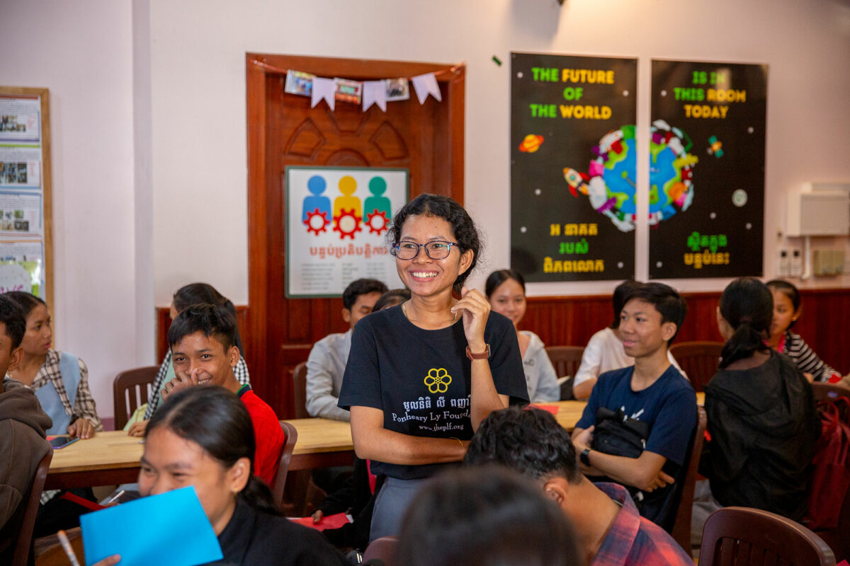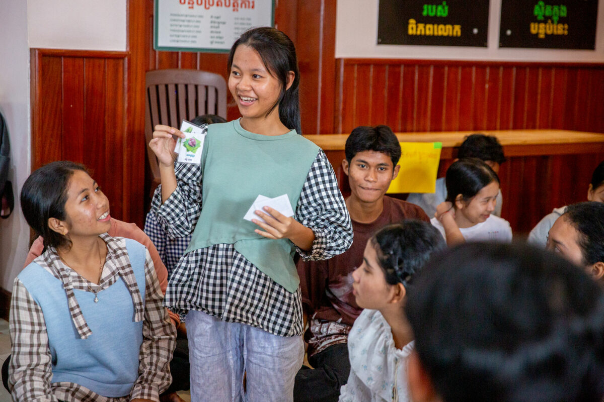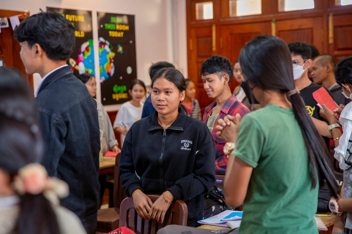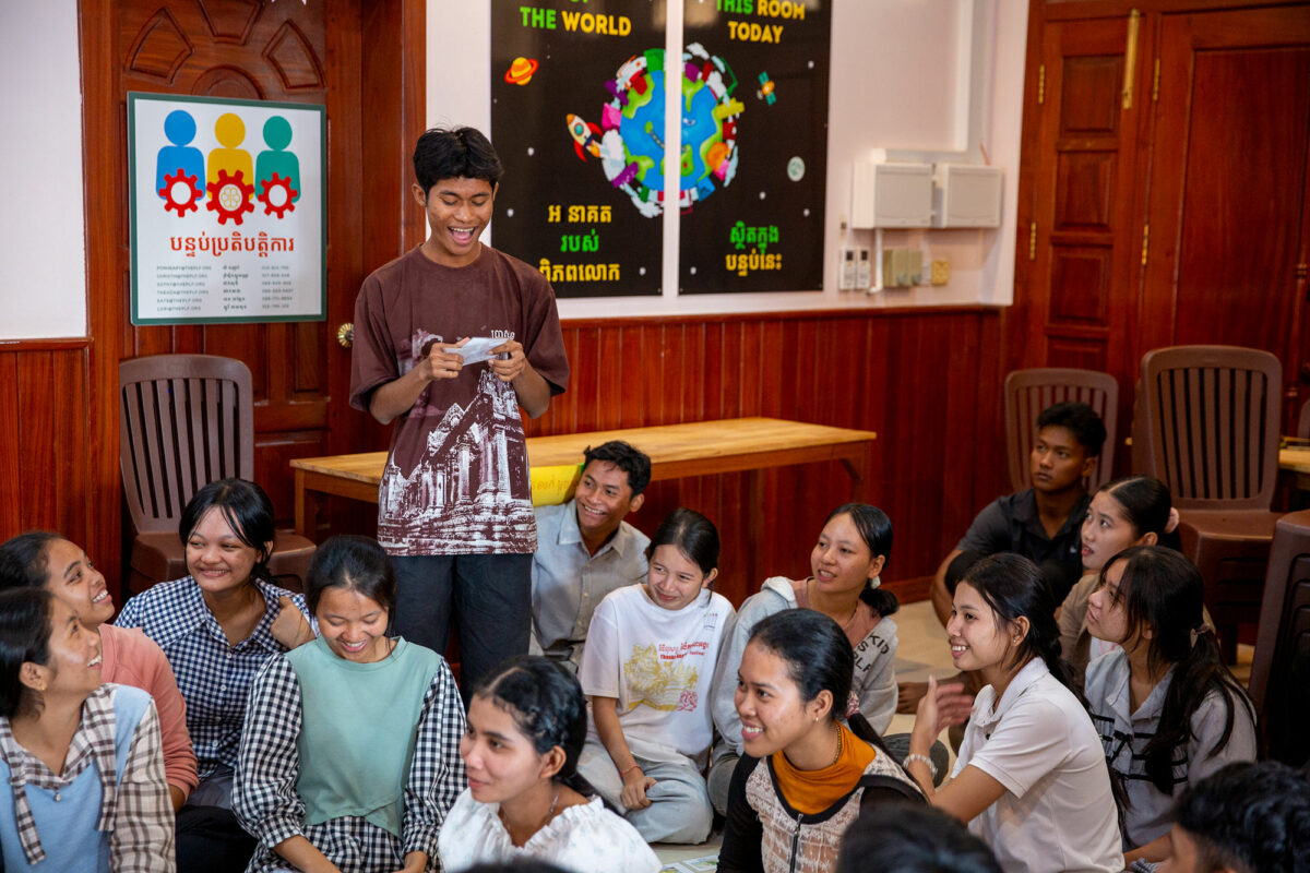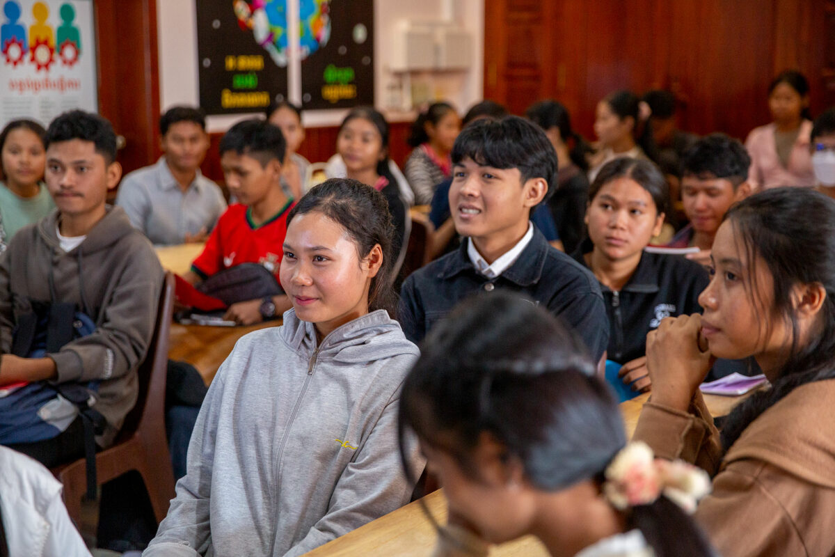 Rund 40 Schülerinnen und Schüler der 12. Klasse nahmen heute am Workshop von Vannak und Kao Ay teil. Gemeinsam diskutierten sie den Unterschied zwischen „etwas wollen“ und „etwas wirklich brauchen“ und sammelten Beispiele dafür, was sie im Alltag kostenlos nutzen können. Ein Aha-Moment entstand, als Vannak und Kao Ay vorrechneten, wie viel sich mit kleinen, regelmässigen Sparbeträgen über Monate und Jahre hinweg ansammeln kann.